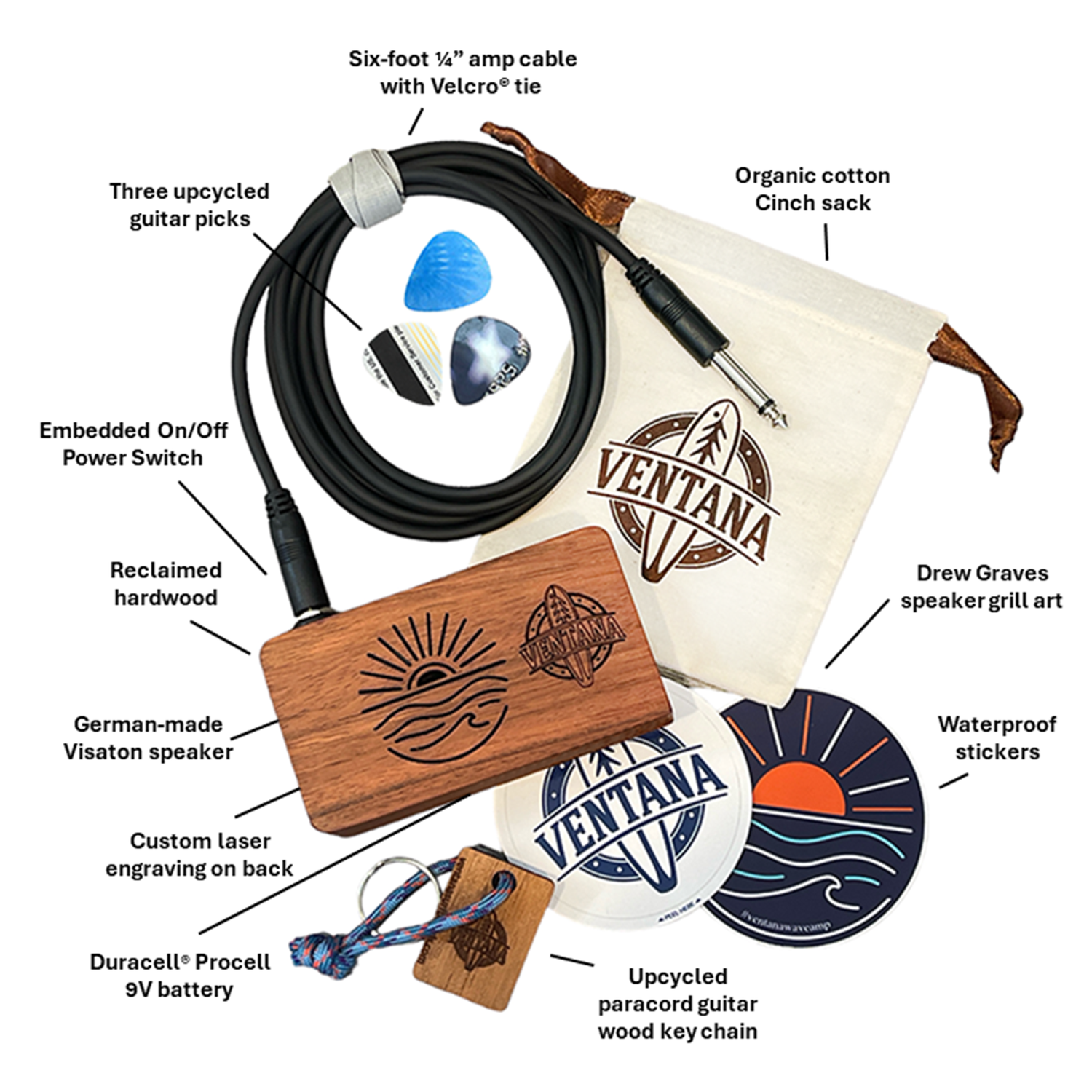 • FREE Speaker Grill and Logo Stickers: We’ll include a 3" sticker that matches the Drew Graves speaker grill and one that sports the Ventana Treefish logo.