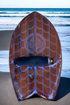 This double concave, glossy, fish-shaped, bodysurfing handplane was created entirely with old growth redwood from a hot tub salvaged in the Santa Cruz Mountains. The nail holes were filled with Entropy Resins, a strong, tree-sap based epoxy, and brass powder.