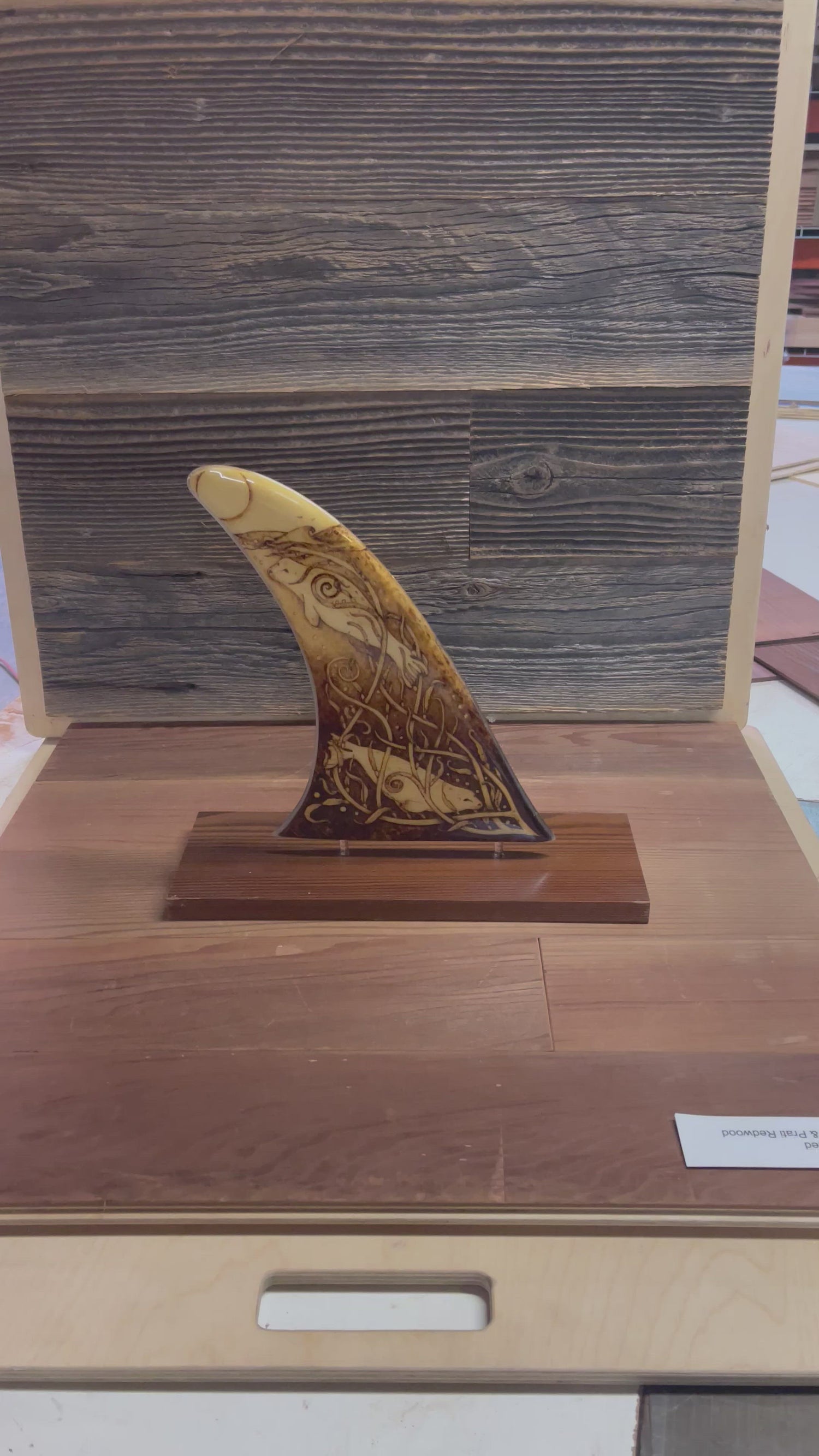 The fin can be fiber glassed onto any surfboard or displayed as an art piece. You can choose a reclaimed wood base from more than ten different historical sources - original Santa Cruz Beach Boardwalk redwood, salvaged elm from San Jose State University, Alaskan yellow cedar from the original Hollywood Bowl benches, Cabernet Sauvignon wine tank redwood, and many more. After purchase, we'll contact you to help you select your base which can be engraved with the Ventana logo or with a custom engraving of your choice.