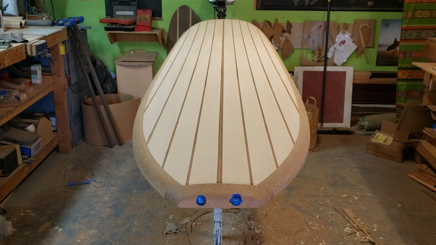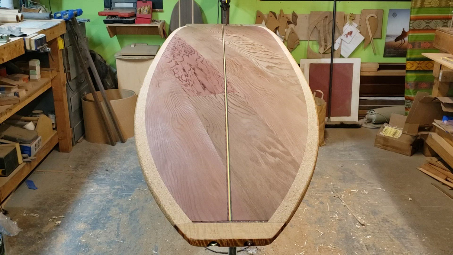 The rails are made of cork, and it was glassed with Entropy Resins Super Sap Resin and 4oz. fiberglass cloth (two layers on top and one on bottom) from Aerialite surf glass.